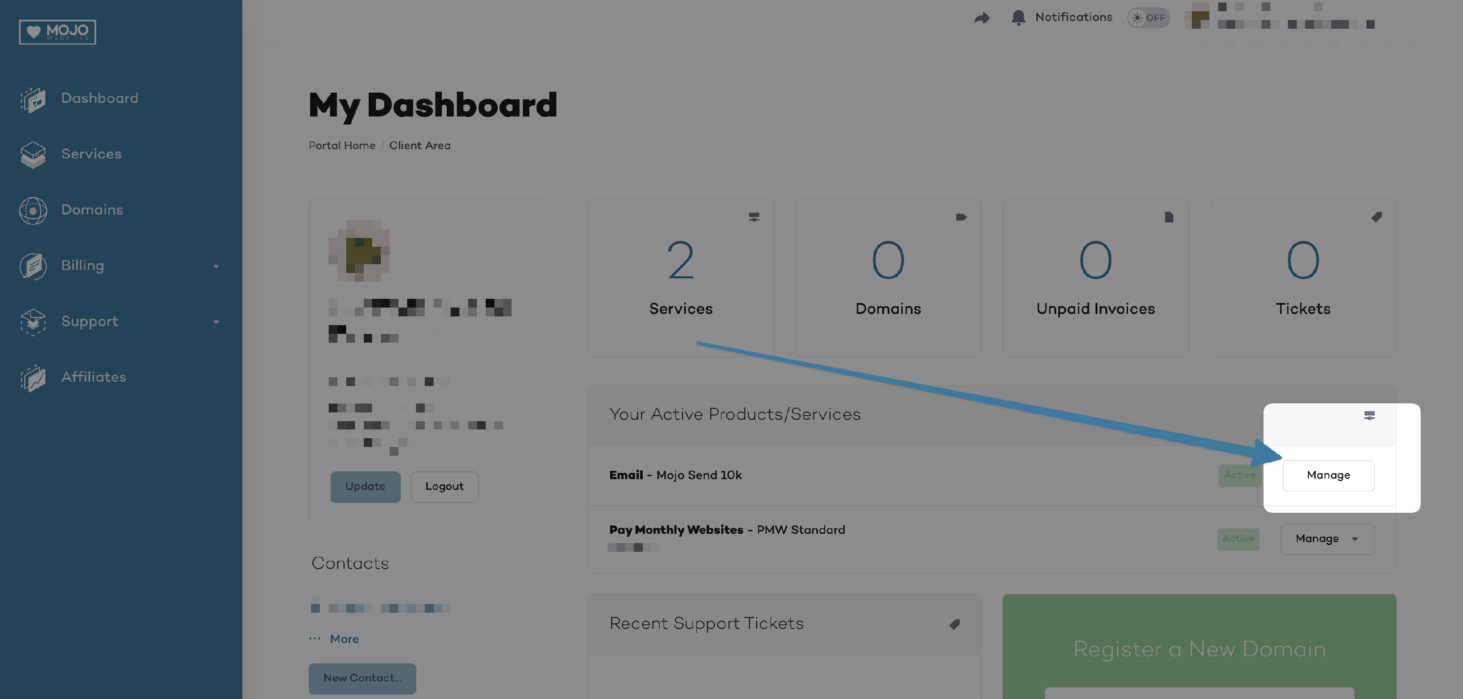 1️⃣ Log into your Mojo Client Area and browse to your Mojo Send management page