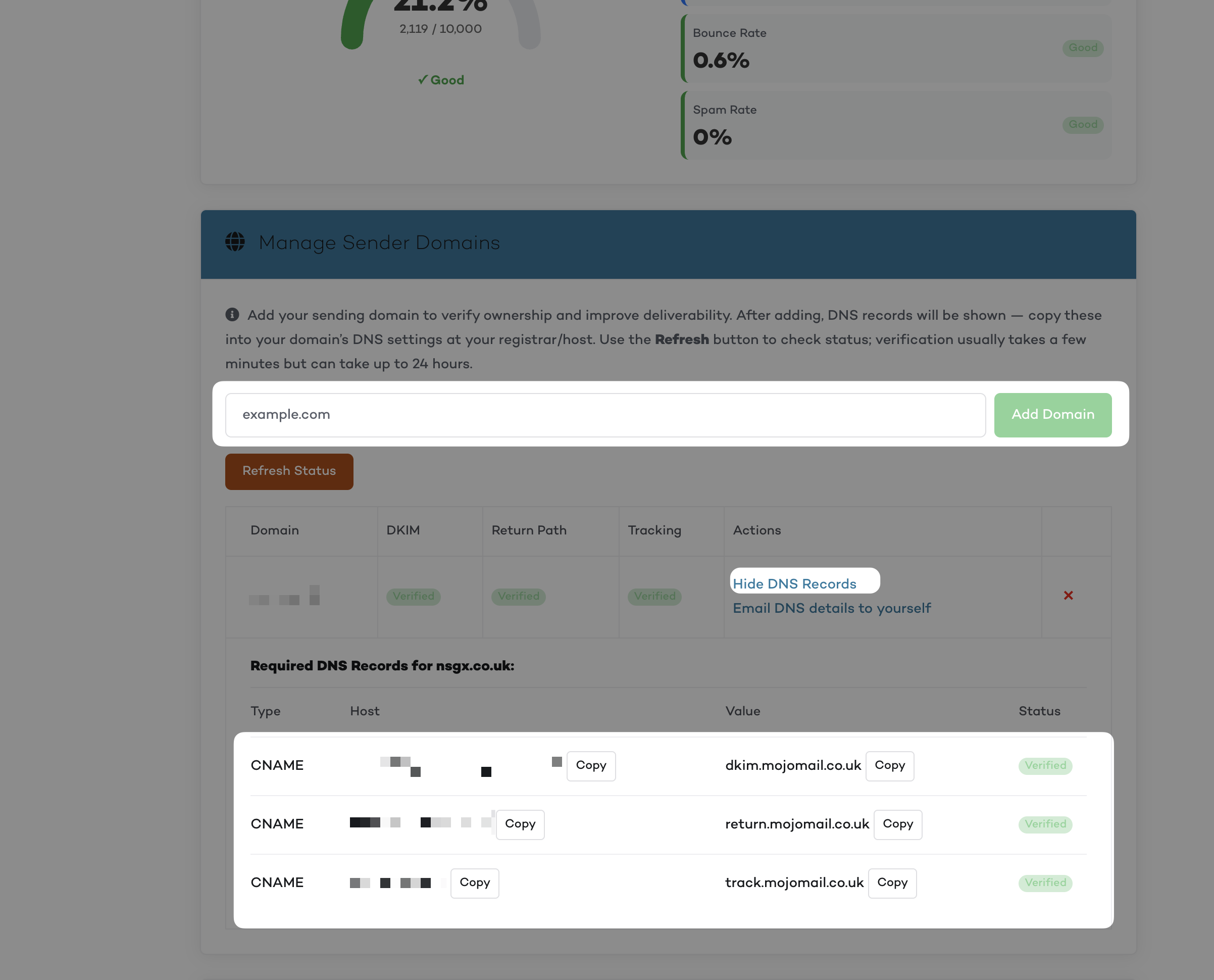 If you’re using Mojo Send as your transactional email service, you’ll need to add a few DNS records to your domain to verify it for sending.