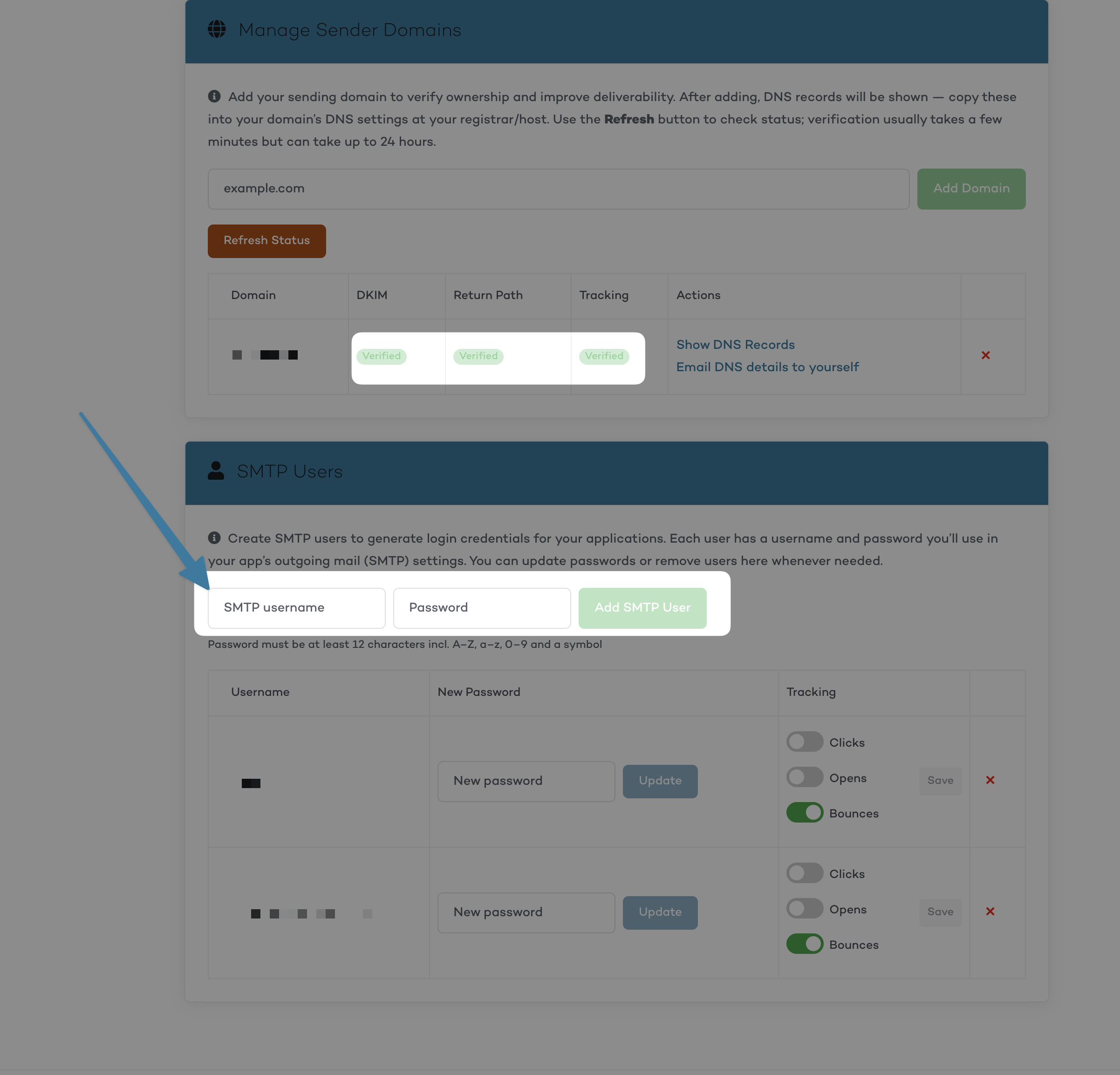 Verify sender domain & add SMTP user
