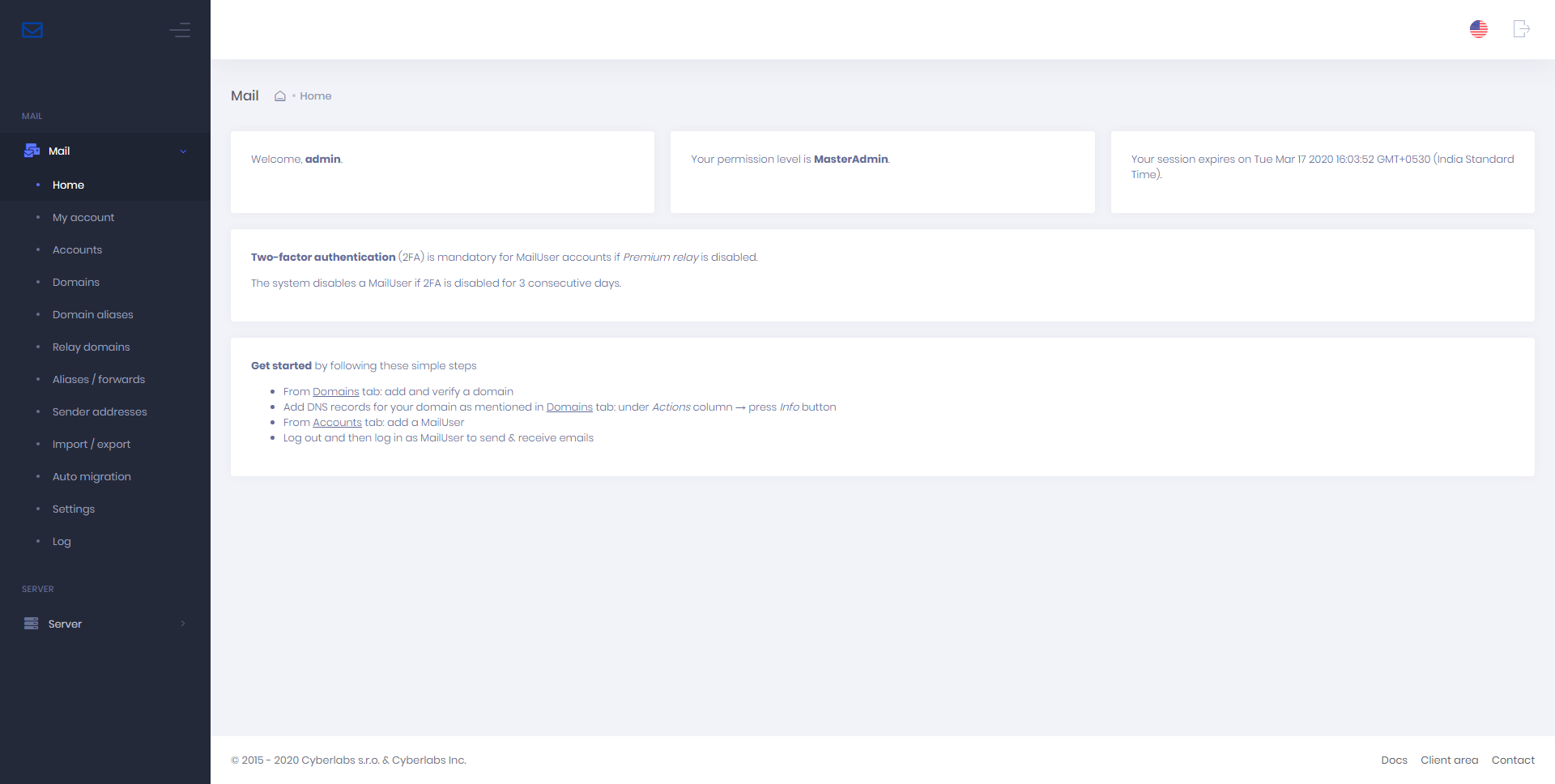 As a DomainAdmin: add domains, create email accounts (MailUser), aliases, forwarders, sender addresses, domain aliases, relay domains, set up migration, and manage account settings.