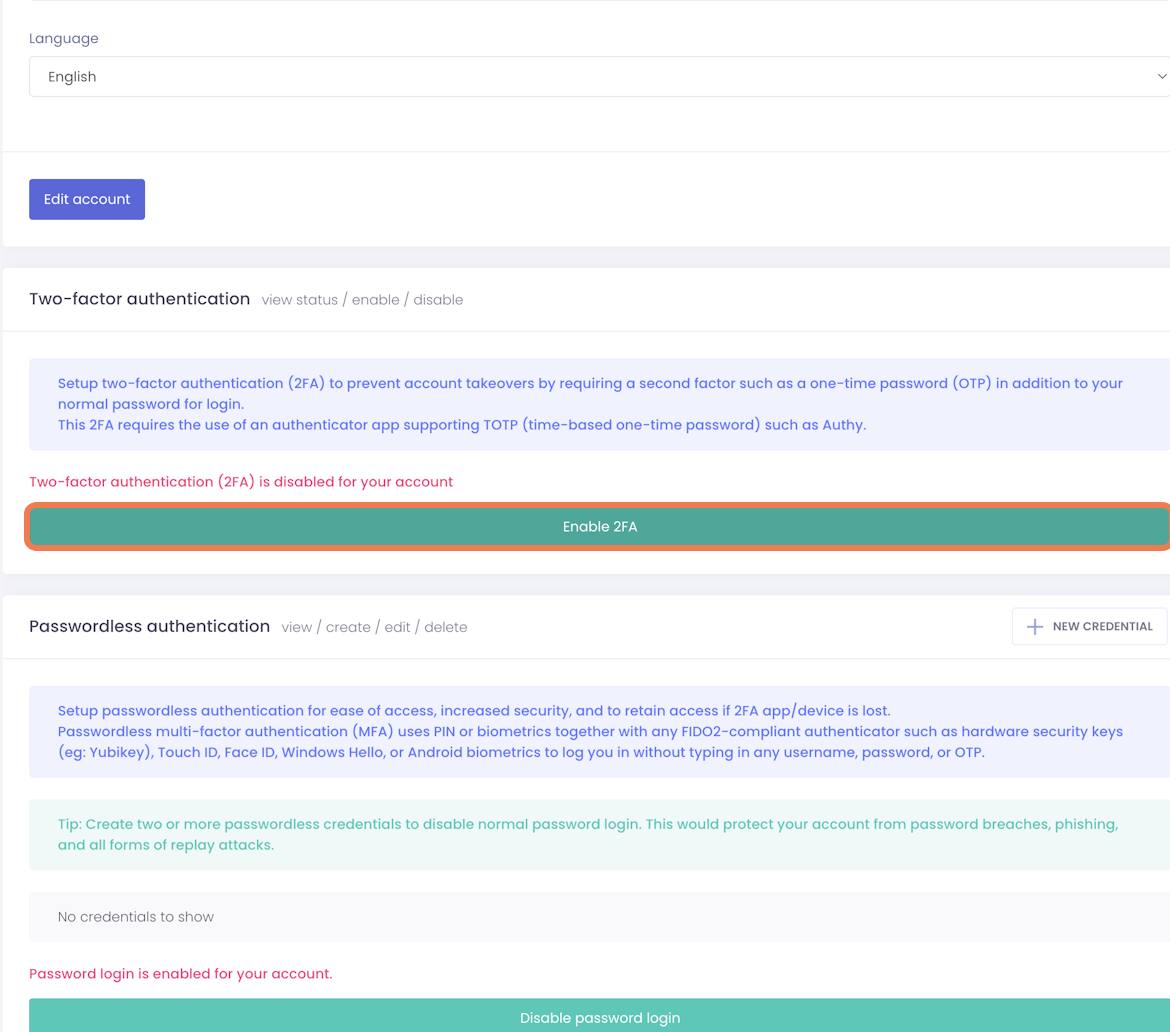8. Click on Enable 2FA and then click Ok on the successfully enabled popup